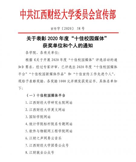此次“十佳校园媒体”评选活动由学校党委宣传部组织评选,旨在促进校园各媒体的健康发展,充分发挥校园媒体平台在思想引领、舆论宣传、价值导向和文化传播方面的重要作用,提高校园媒体的影响力。在本次“十佳校园媒体” 评选活动中获得表彰的集体和个人将珍惜荣誉,充分发挥示范、引领作用,加强学院媒体宣传队伍建设,创作出更多富含时代风貌、彰显江财特色的优秀作品。