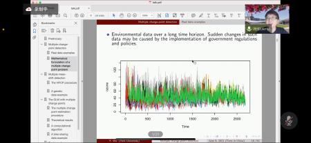 首先,吴月华教授简要介绍了多变点问题的概念和相关公式推导,并将多变点问题用于均值转化模型、自回归模型、线性回归模型的模型建立与实证结果进行了展示和分析。同时将多变点检测应用于现实中的环境气候改变、长期数据的收集、地震的检测、数字图像矩阵等问题进行了实证模拟,并对数据模拟的结果进行分析。