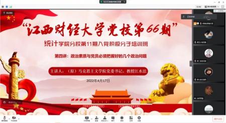 4月17日下午,统计学院于线上开展了积极分子党校培训班第四次党课,马克思主义学院江水法教授应邀主讲,统计学院党校全体参训学员参与课程学习。