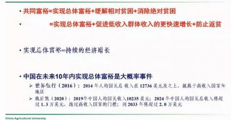 讲座开始,林万龙教授强调,巩固脱贫成果、不发生规模性返贫是实现共同富裕的底线要求,缓解相对贫困是实现农民农村共同富裕的核心任务。2020年底,我国全面建成了小康社会,历史性地消除了绝对贫困问题,如期实现了第一个百年奋斗目标,为追求共同富裕打下了坚实的基础。从摆脱绝对贫困走向农民农村的共同富裕,不仅需要牢固树立底线思维,还需要准确把握实现农民农村共同富裕途中的核心任务,探索相应的政策体系。巩固脱贫成果、不发生规模性返贫是实现共同富裕的底线要求。
