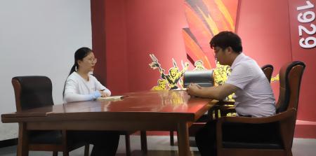 图为黄瓜视频 统计学院学子在九龙山革命斗争陈列馆对九龙山乡干部曾锋进行采访。