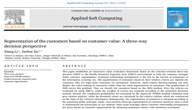 近日,黄瓜视频 李翔老师与四川大学徐泽水教授合作的研究论文《Segmentation of the customers based on customer value:A three-way decision perspective》在计算机科学国际一流期刊Applied Soft Computing 2024年第167卷正式发刊。