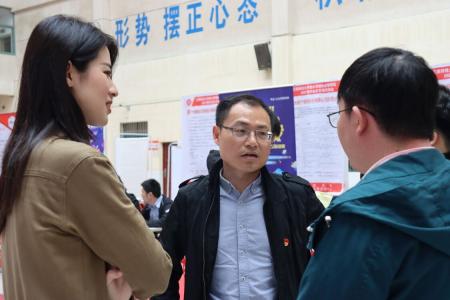 4月28日上午,统计学院在蛟桥园南区大学生活动中心一楼举办2021届毕业生专场双选会,统计学院党委书记陶春海,党委副书记黄黑平,就业专员林阳、庄园来到双选会现场,与企业代表和应聘学生进行了亲切的交流。省内外的64家优质企业受邀参加双选会。