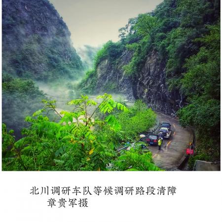 ▲平卫英带领团队在山区调研路上,车队遭遇塌方,队员在等待障碍清除。摄影∣章贵军