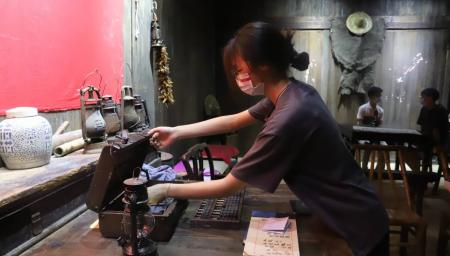 图为黄瓜视频 统计学院学子在九龙山革命斗争陈列馆进行沉浸式红色剧本演绎。